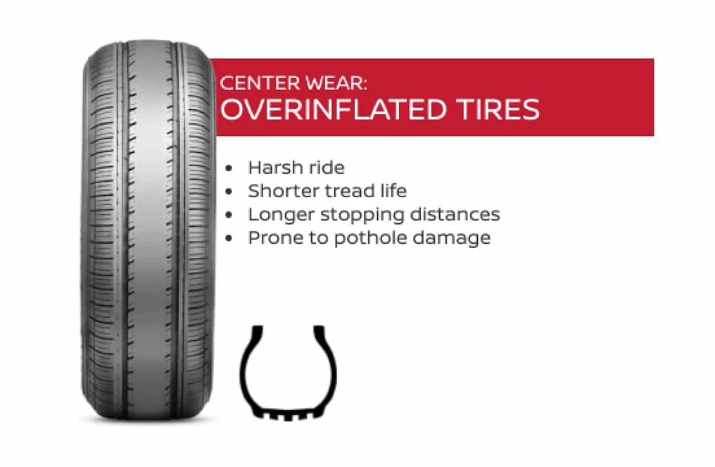 Overinflated tires wear down the center tread faster, reducing ride quality and safety.