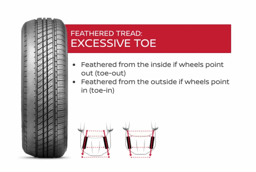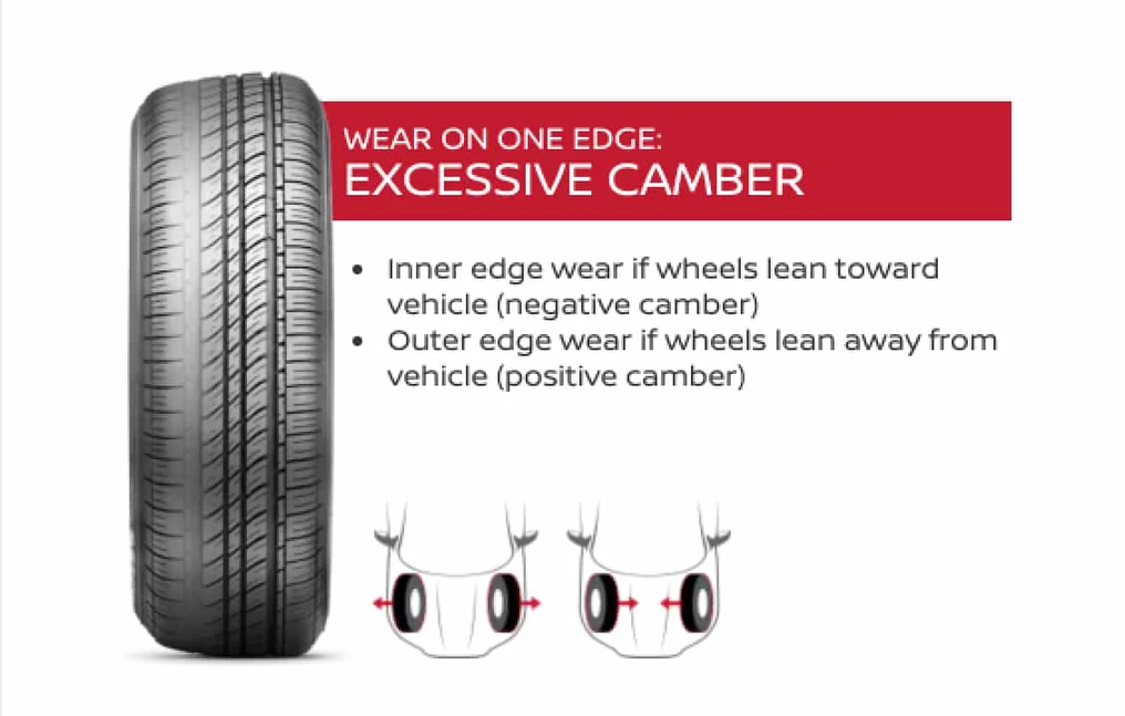 Excessive camber wears the inner or outer edge of the tire depending on wheel alignment.