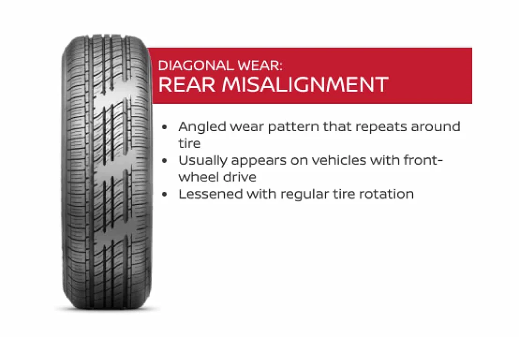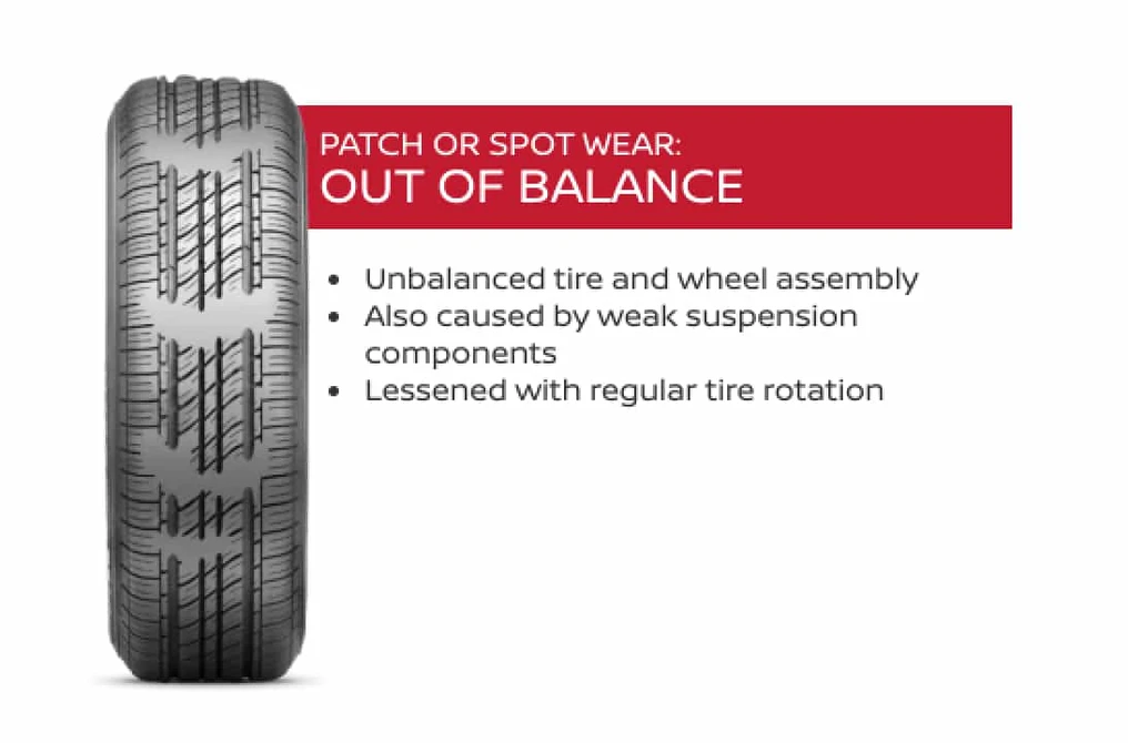 Out of balance tires create patchy wear from unbalanced wheels or weak suspension.